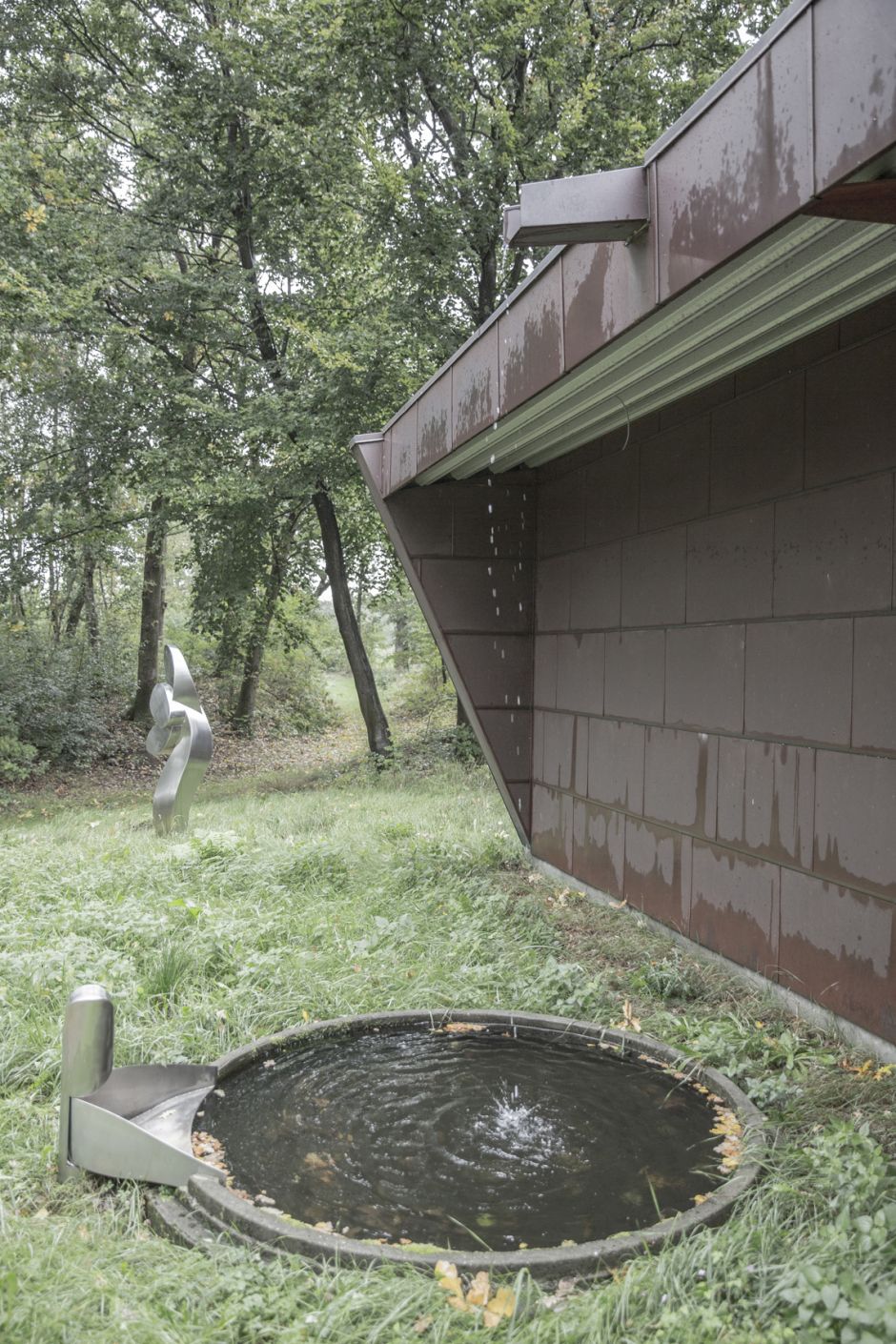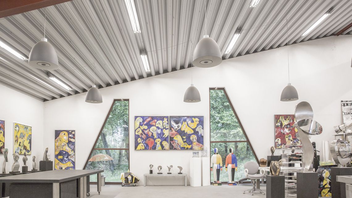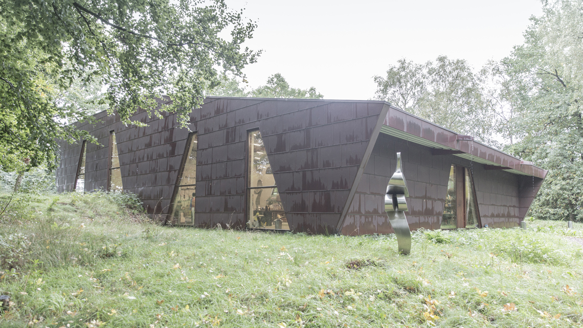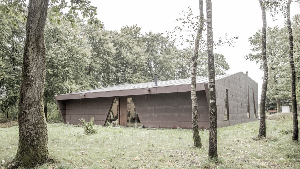 Located discreetly, almost anonymously in the woods Atelier Pedersen is a 300 m2 atelier and studio for ultimate creative freedom. The copper facade reflects the sun's light through the treetops and at the same time has a print inspired by tree trunks. The triangular windows mimic the spaces between the logs of the forest and, like the rest of the architecture, they cut through the woods and once your eye has captured the building it stands beautiful and clear among the trees.