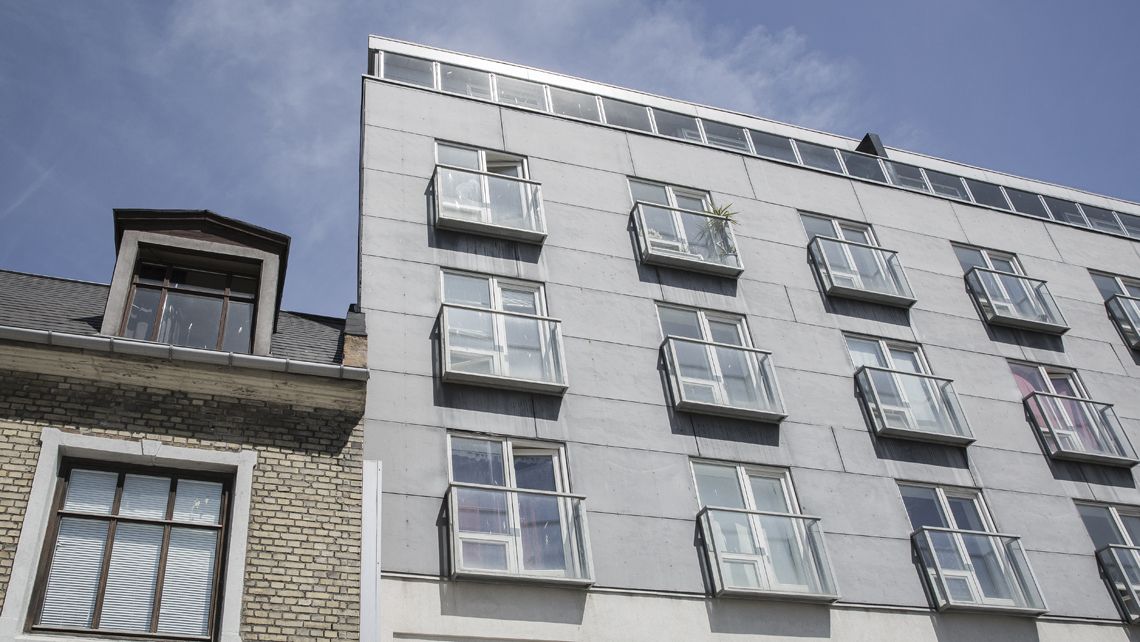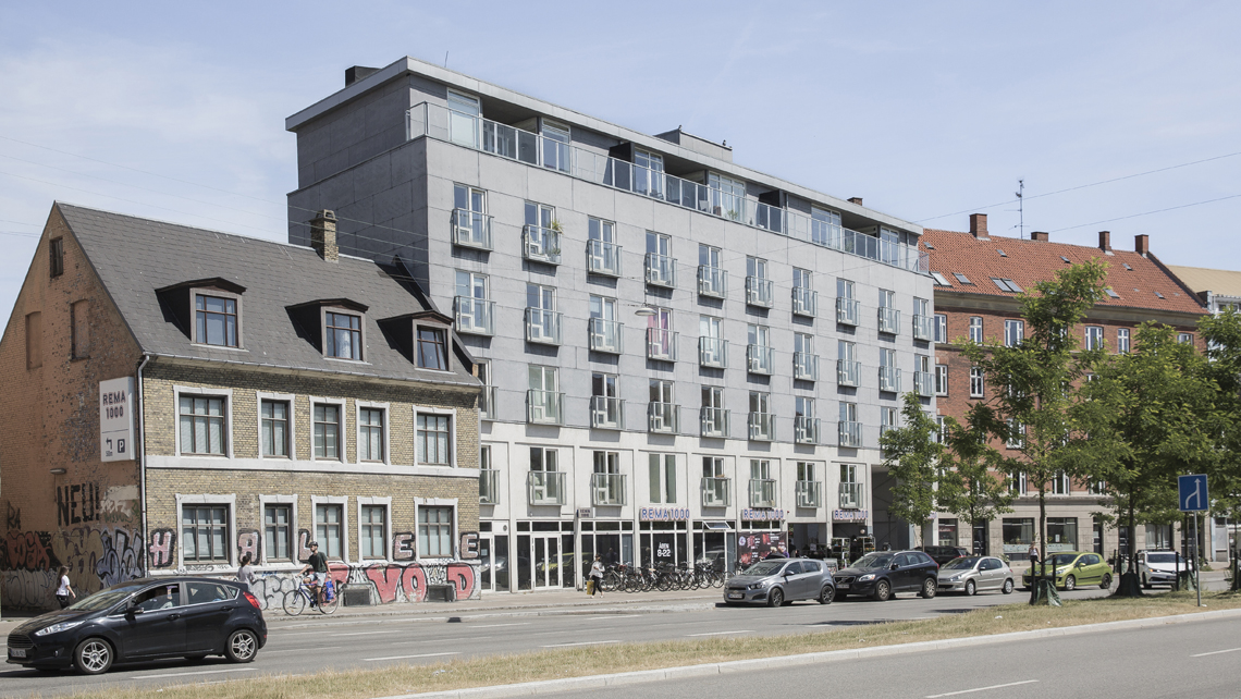 Wedged in between traditional Copenhagen blocks this project is located on Frederikssundsvej, which is a busy thoroughfare in Copenhagen. The building is light and airy with small balconies on the roadside and larger balconies facing the backyard, which highlights the use for living. This is further emphasized on the backside where the ground floor is extended perpendicular to the block, and a large recreational area on the roof terrace is thus created as an urban oasis in this busy and modern district.