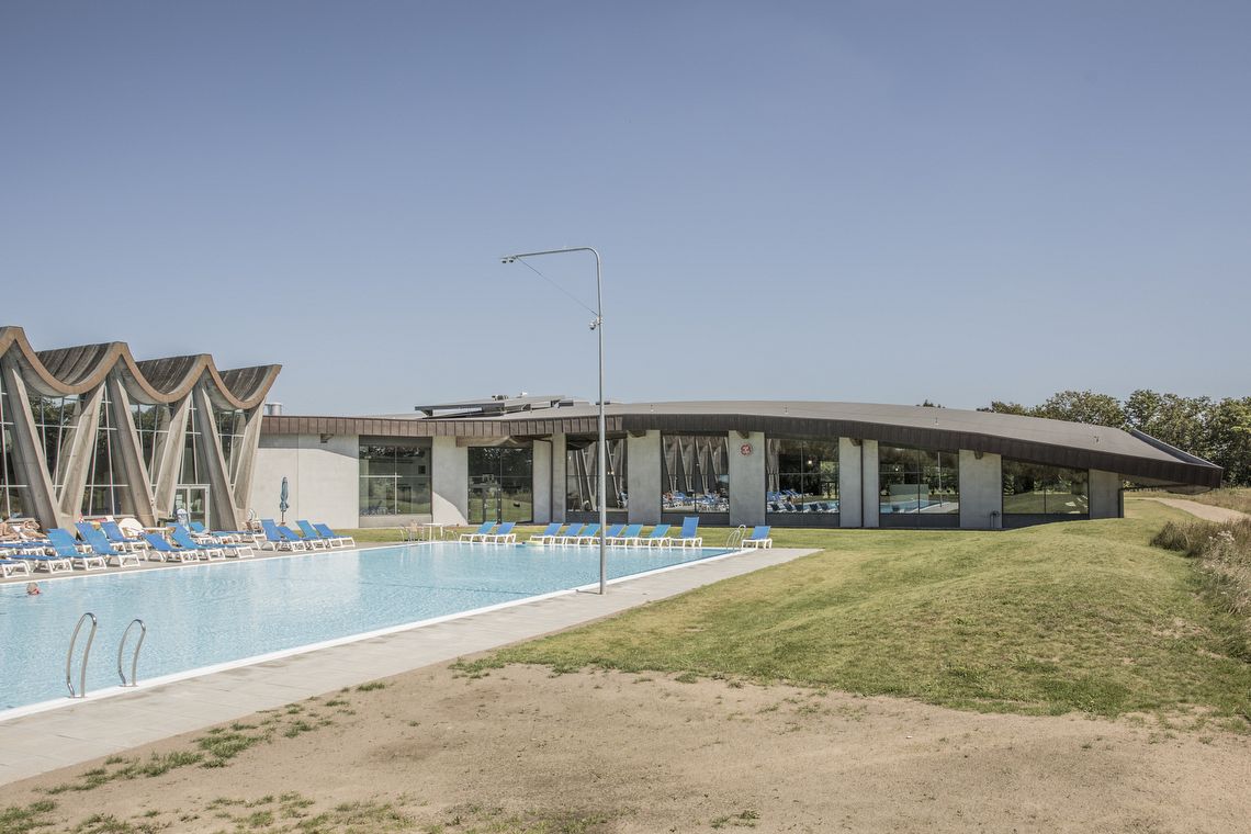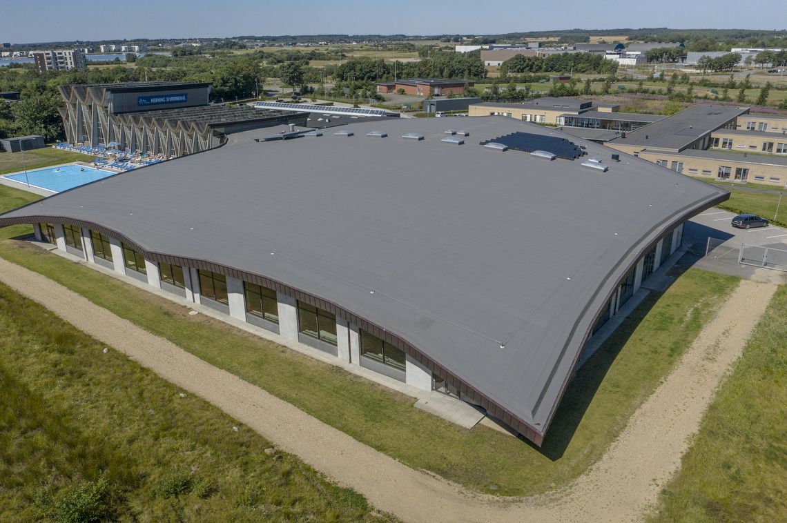 Det bølgende tag fortsætter formsproget fra den eksisterende bygning og afspejler bygningens funktion ved at have klare referencer til svømmeverdenen fra lette bølger til dynamiske svømmetag.