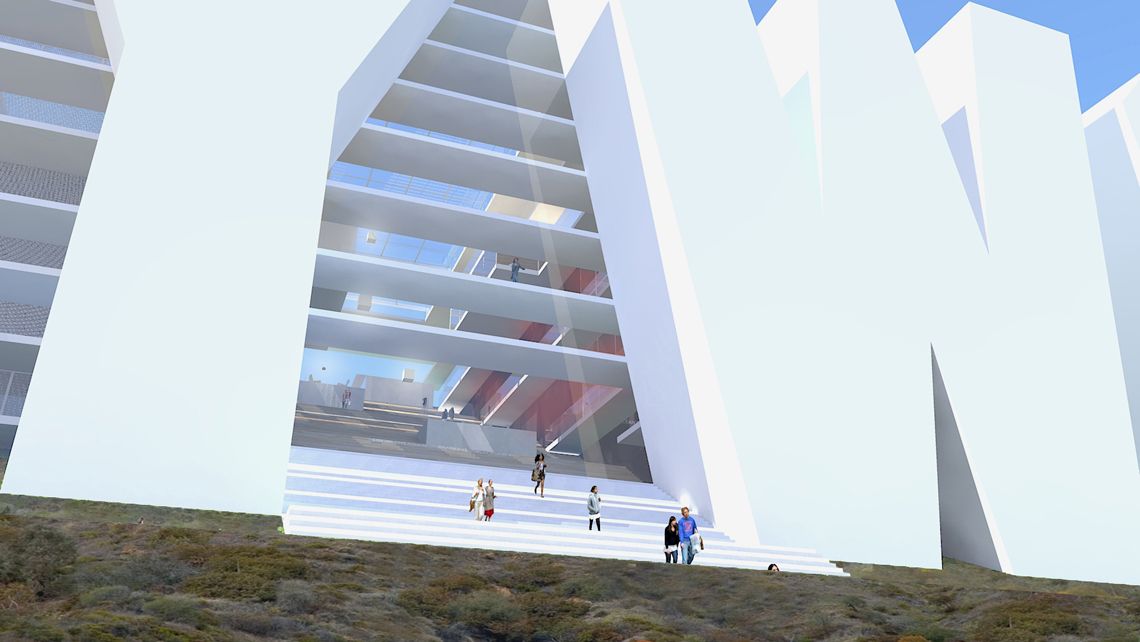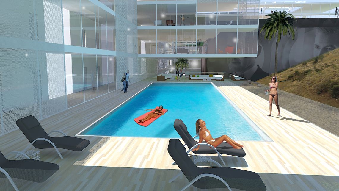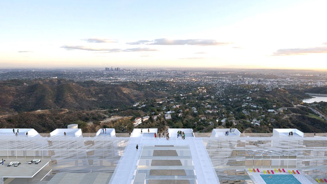 Bay Arch foreslår at bygge et hotel på bagsiden af skiltet, der både får det maksimale ud af udsigten til værelser, suiter, men ligeledes benytter arkitekturen og det omkringliggende landskab til at skabe unikke offentlige områder både i og omkring hotellet.