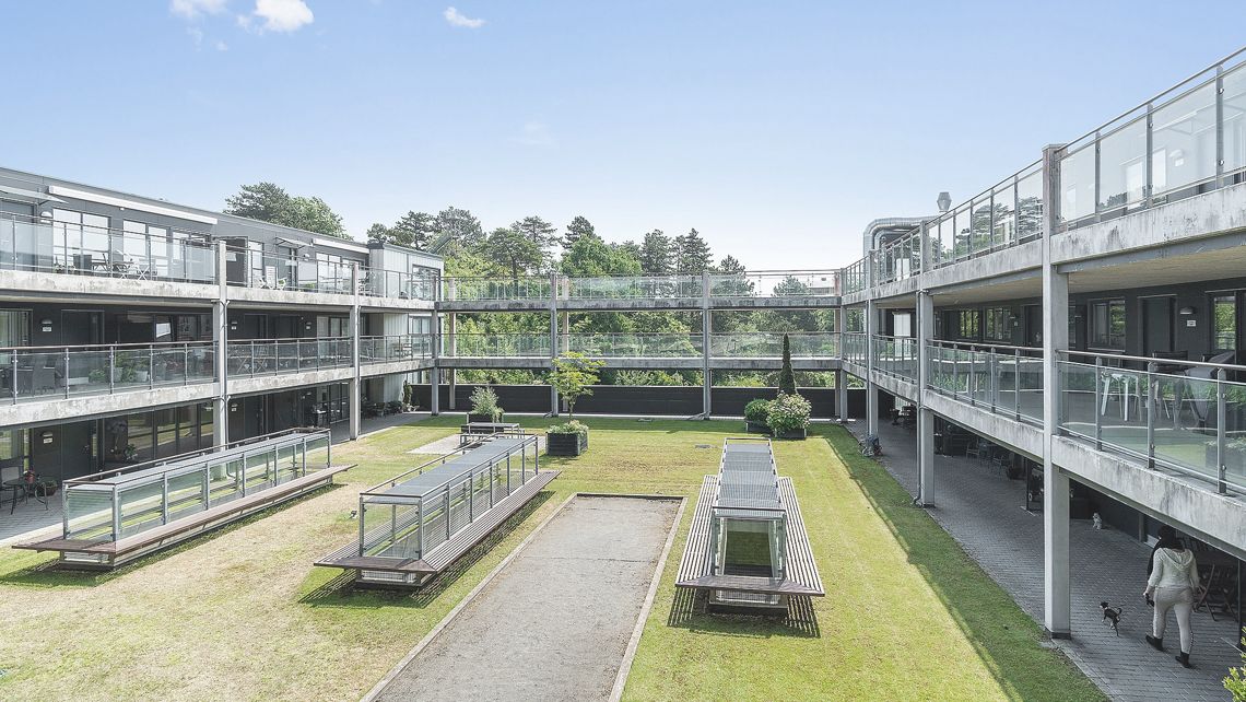 Arkitekturen er tilpasset området og den let skrånende vej og på bagsiden inddrages lejlighederne og det omkringliggende grønne område i en stor gårdhave, der er perfekt til afslapning og børneleg.