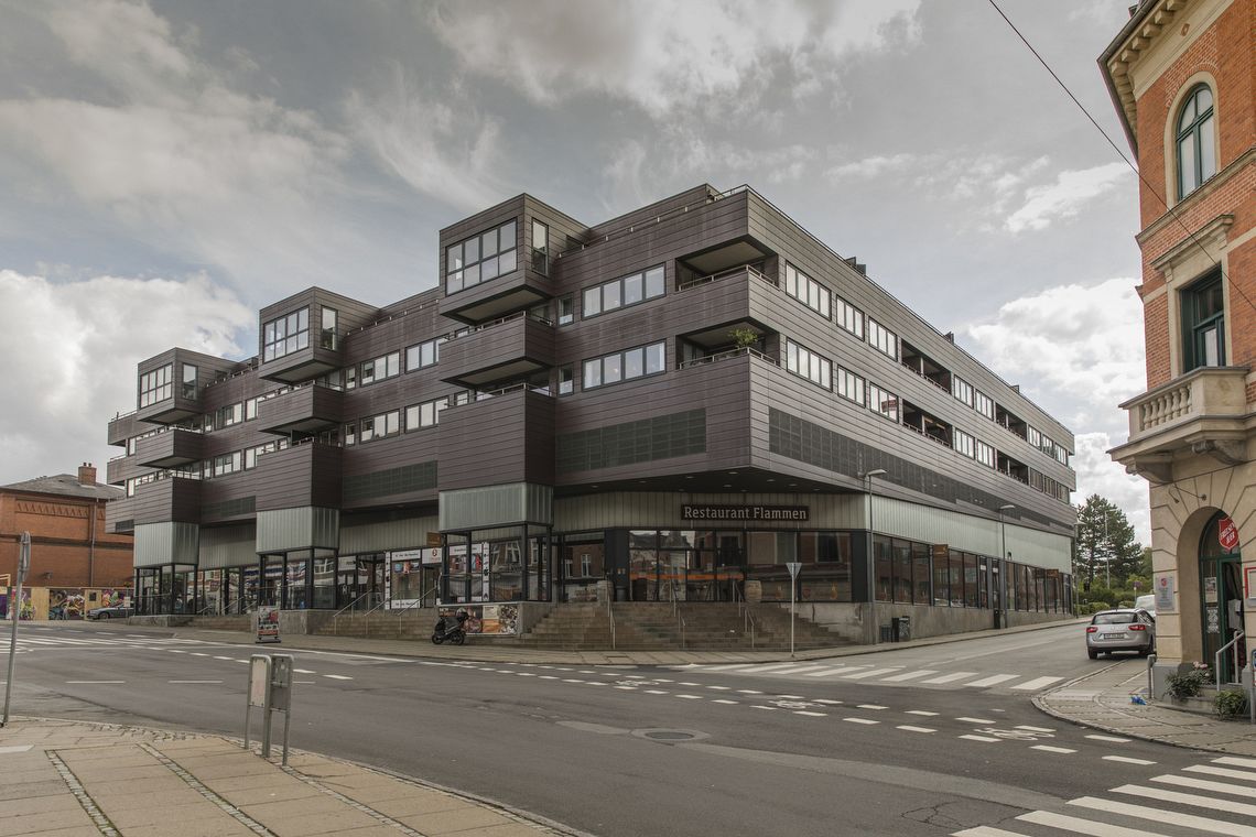 This project is called Kobberhjørnet (The copper corner) because the main material of the facade is copper. It is a cooperative apartment building build on top of a retail space and parking lot. The architecture leans slightly downwards at the corner as to follow the sloping road. The design is a modern twist on classical red brick city apartment buildings.