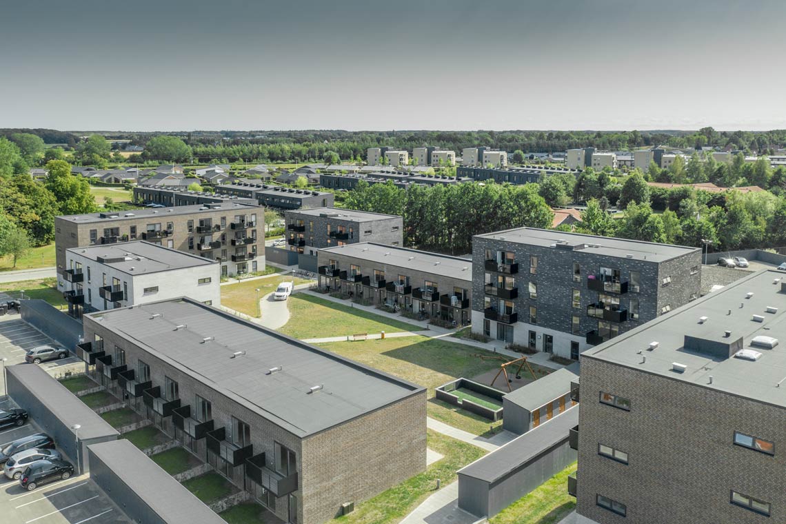 Bebyggelsen skabes af lejlighedsblokke og rækkehuse der omkranser et aktivt og hyggeligt haverum.