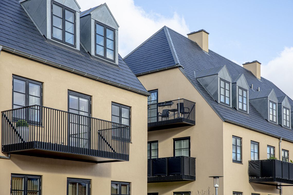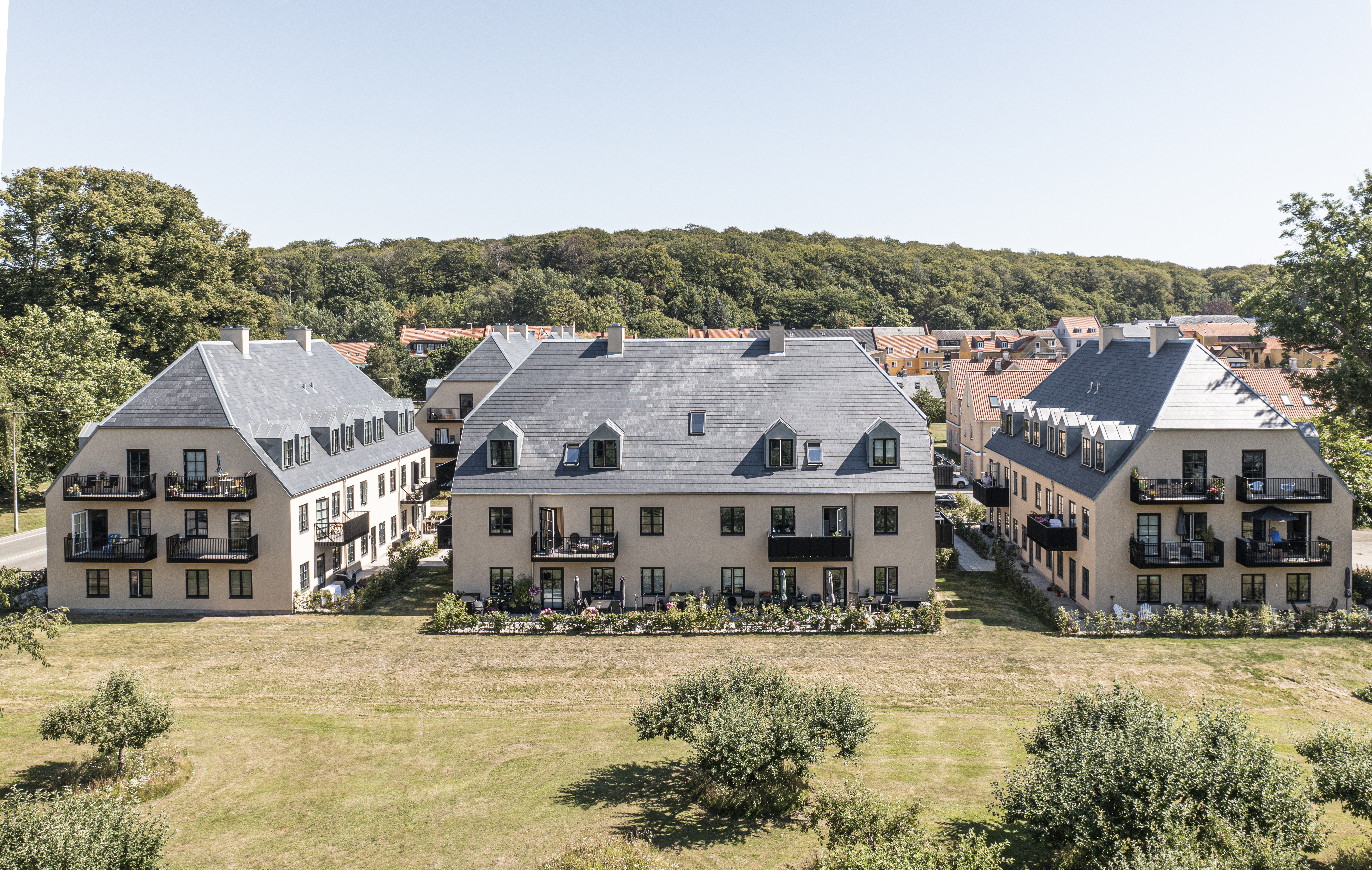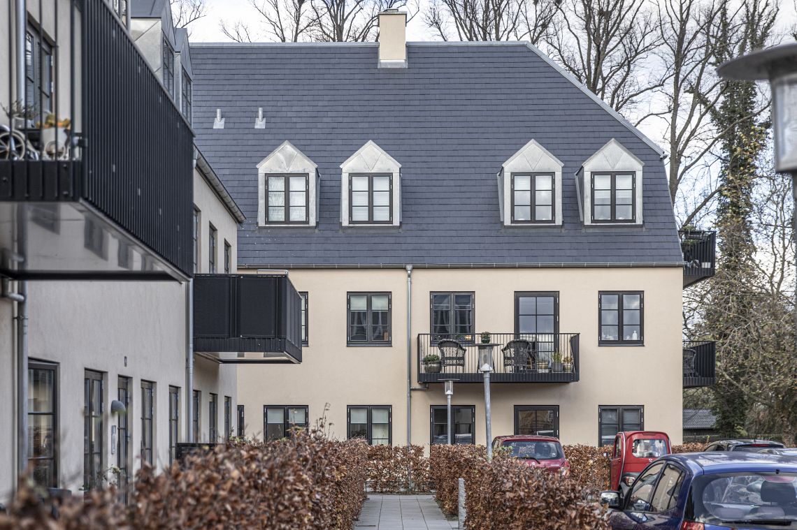 The project, Holmebakken is a small gathering of houses made for seniors, like a senior village. The village consists of houses, a common house and different common areas spread over 3000 m2. The architecture has a clear focus on creating light and airy living conditions, so the houses all have skylights and the same one-sided roof slope creating a dynamic architecture and securing as much sunlight as possible in the high-ceiled rooms.