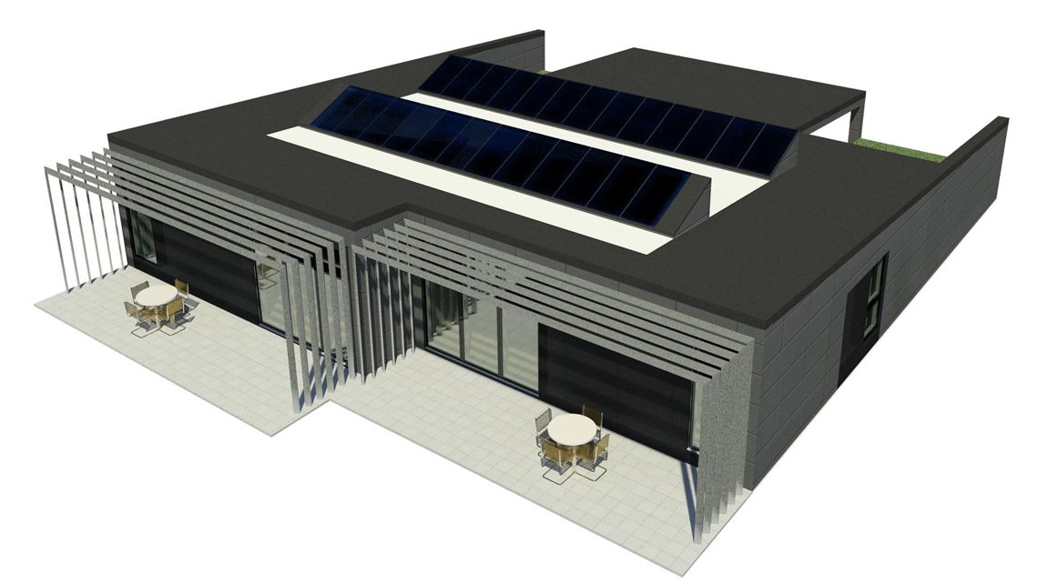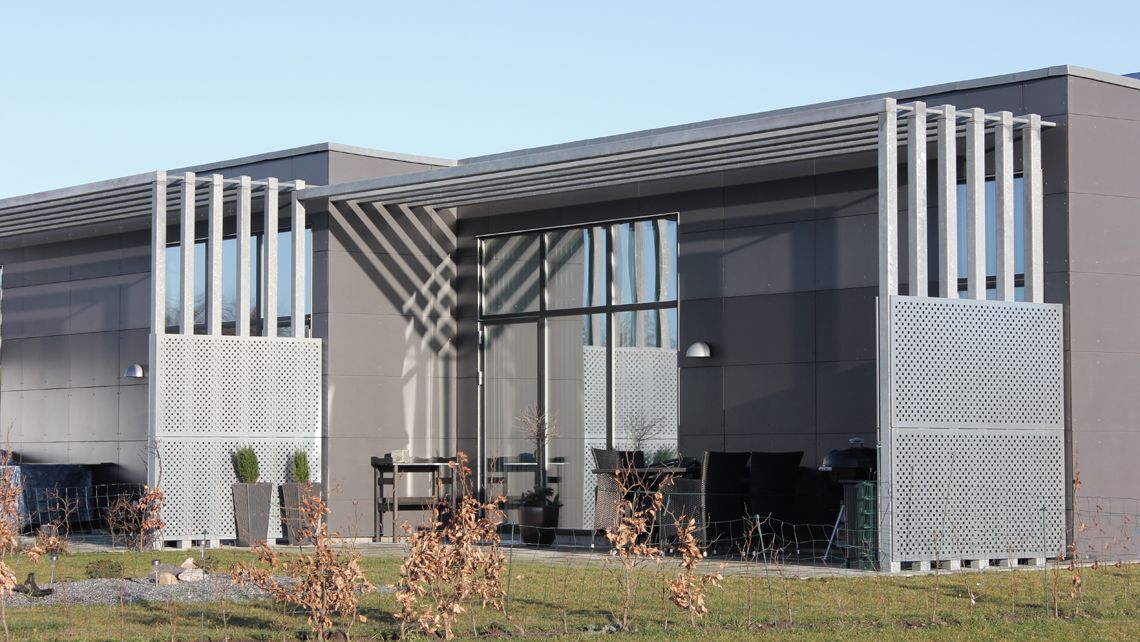 Derudover er der solafskærmning, som dog giver plads til udsyn og skaber flotte mønstre på facaderne og de flisebelagte terrasser.