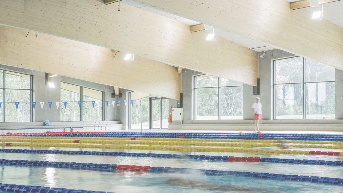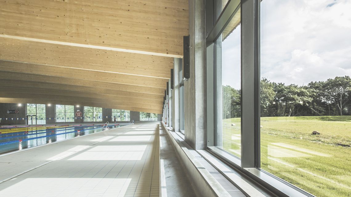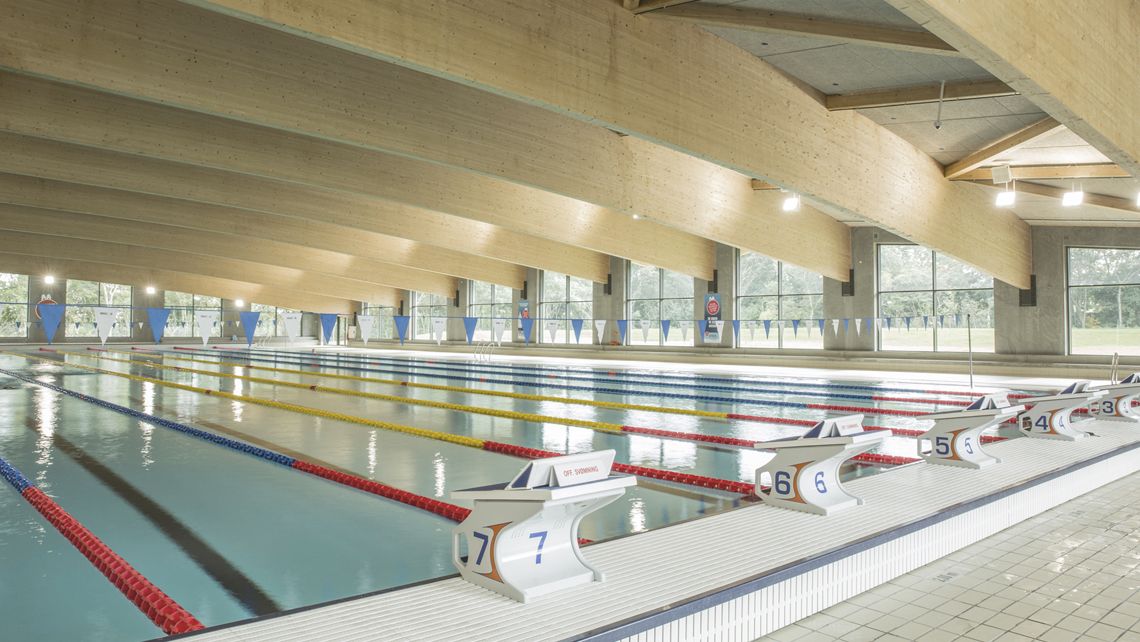 The wavy roof continues the idiom of the existing architecture and also reflects the inside use of the building, by showing a clear reference to the swimming world – from the light waves to the dynamic swim strokes.
