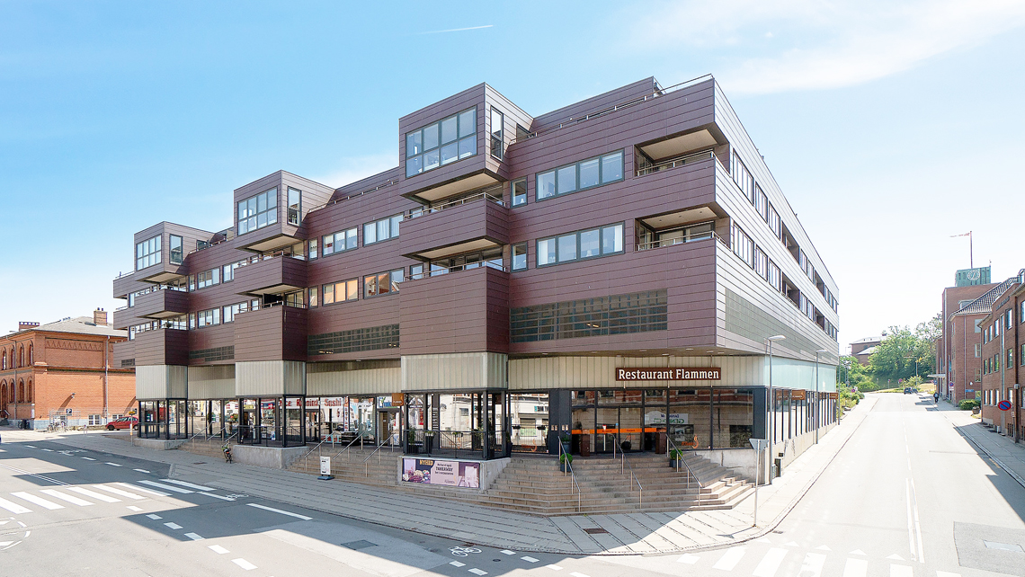 This project is called Kobberhjørnet (The copper corner) because the main material of the facade is copper. It is a cooperative apartment building build on top of a retail space and parking lot. The architecture leans slightly downwards at the corner as to follow the sloping road. The design is a modern twist on classical red brick city apartment buildings.