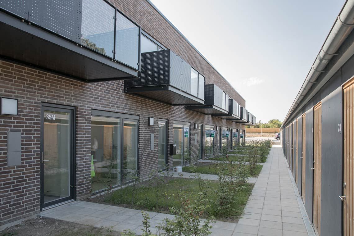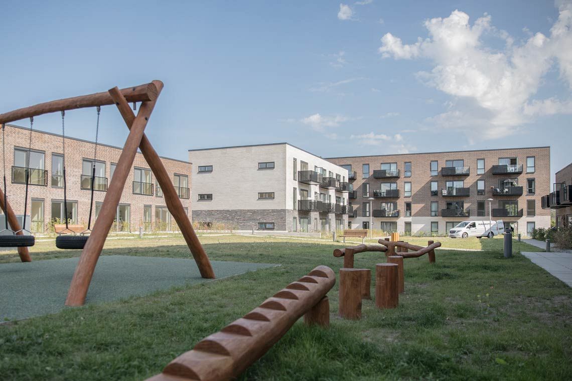 Bebyggelsen skabes af lejlighedsblokke og rækkehuse der omkranser et aktivt og hyggeligt haverum.